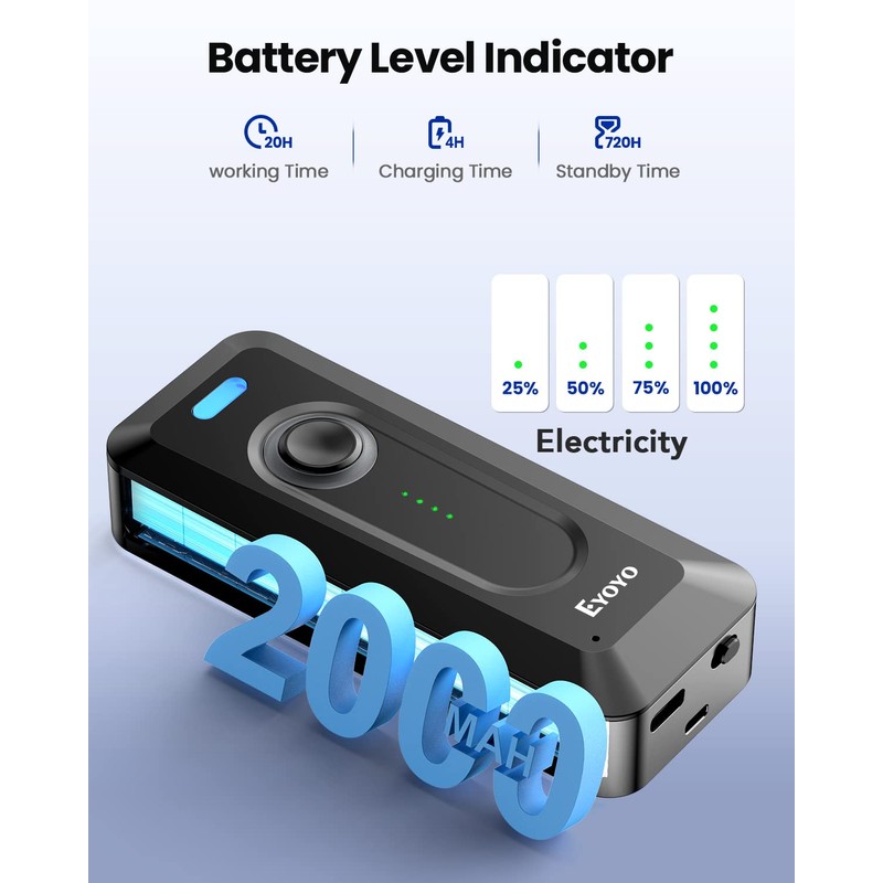Eyoyo Eyoyo 2D Bluetooth Barcode Scanner Wireless with Clip, 2000mAh Battery with Level Indicator, Portable Mini QR Bar Code Reader for Library Book Inventory Compatible with iPhone, iPad, Android Phone