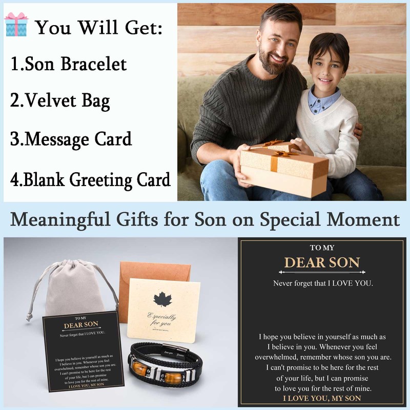 • Son Gifts - The Leather Bracelet engraved with "Love you forever", the ideal gift for your beloved son! The tigers eye stones embedded in the bracelet is a protective stone, that can bring good luck, making it heartfelt son gifts for men.