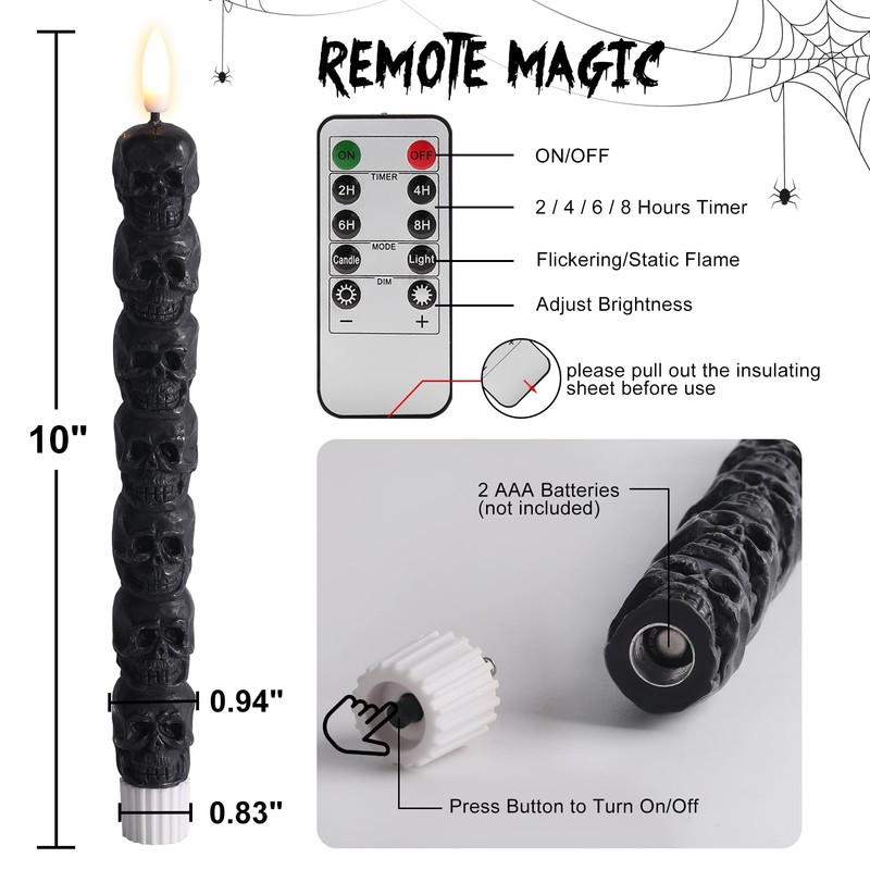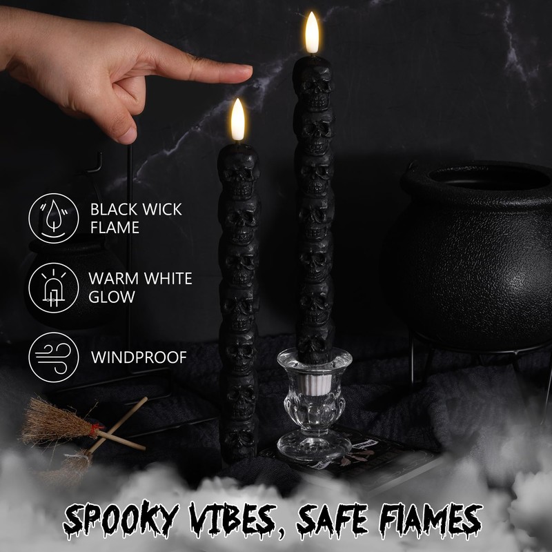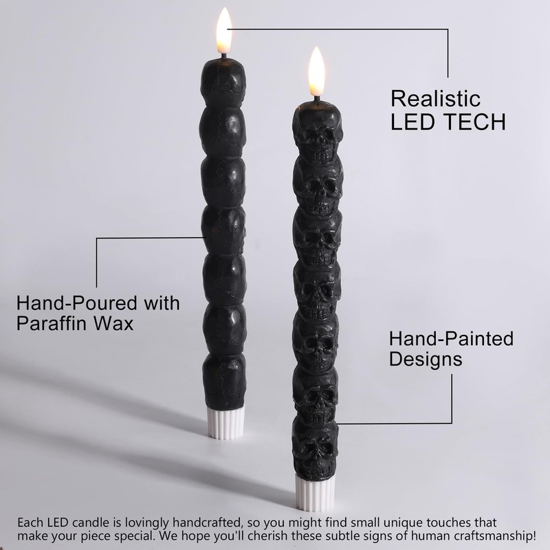 - Halloween Flameless Candles - stacked spooky black skulls shapes with realistic candle appearances make it an eye-catching decoration for Halloween