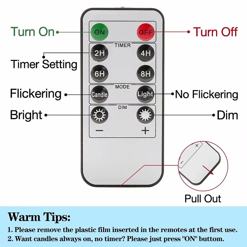 - Convenient Remote & Timer Function - remote controller works for all 3 candles, convenient for you to display these flameless candles in hard-to-reach places, modes: ON/OFF, 2/4/6/8 Hours Timer, Dim/Brightness, Flickering/Static Flame within 20 feet.