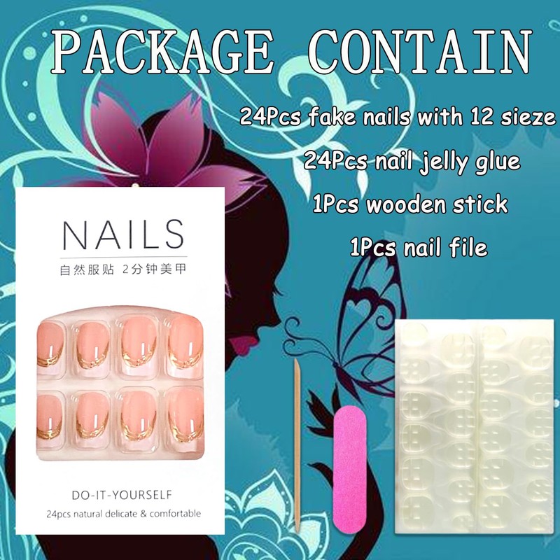 - Package: You'll get 24 french short square false nails in 12 sizes. 1 mini nail file, 1 small wooden stick, 1 piece of nail glue sticker. Glue on nails are perfect for most people's nails