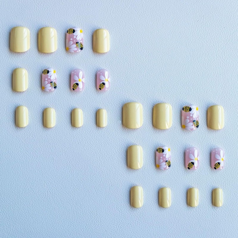 EYZOTSF Press on Nails Short Square Shaped Glossy Full Cover Acrylic Square Short Length False Nails with Floral Bee Designs Artificial Extra Short Fake Nails Glue ons Fingernails for Women Girls