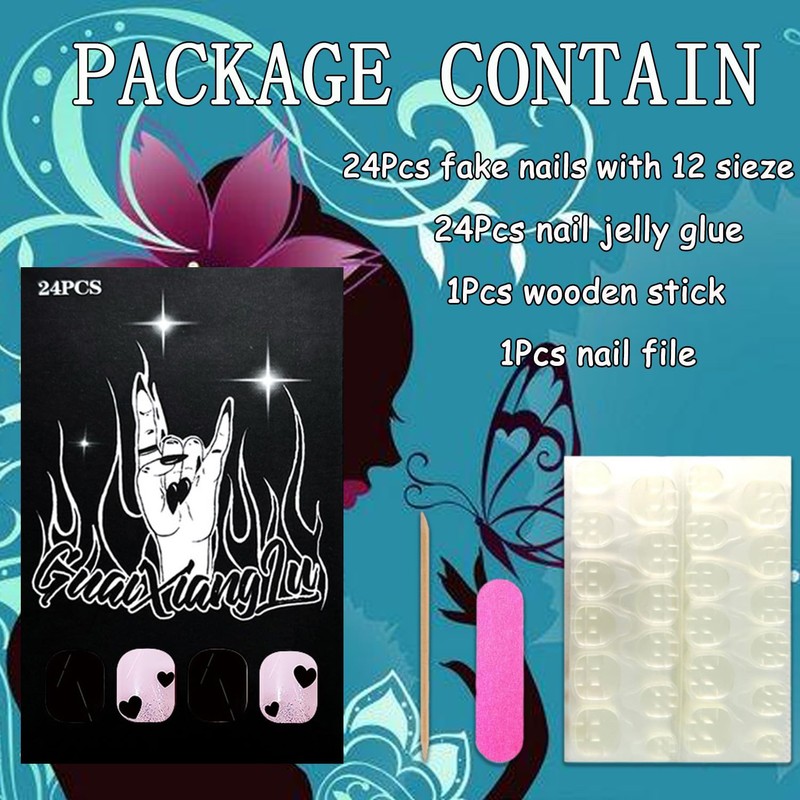 - Package: You'll get 24 french Valentine's Day false nails in 12 sizes. 1 mini nail file, 1 small wooden stick, 1 piece of nail glue sticker. Heart glue on nails are perfect for most people's nails
