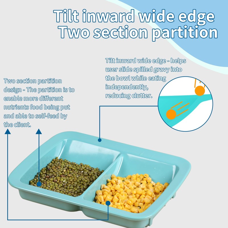 - Partition,Concave edge profile,Inclined surface design: Four section partitions design to separate the food favor. The partition is to enable more different nutrients food being put and able to self-feed by the client. Inner partition with inclined surface is designed to help sliding the food across and also good for doing training. The concave section on the utensil helps those with arthritic hands scoop food onto the raised side, making it easier to eat and promoting muscle movement during self-feeding.