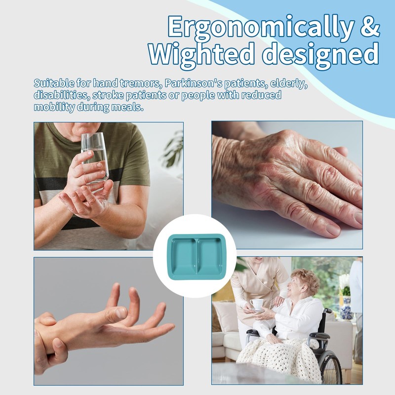 - Designed product weight and Non-slip pad: Ehucon’s Melamine Adaptive Diner set is designed to have its heavy feel solid weight and four non-slip pads are underneath the plate, it aims to prevent the slipping off when there is pushing force exerted during a self-feeding. It is not easy to break even when it falls. Ehucon's utensils suits hand tremors, Parkinson's patients, seniors, disabled individuals, stroke patients, or those with reduced mobility during meals. The set encourages self-feeding when muscle movement is restricted.