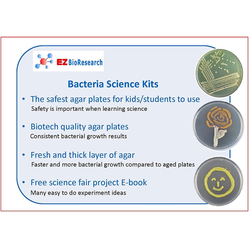 EZ BioResearch Bacteria Science Kit (IV) (Gift Pack): Prepoured LB-Agar Plates and Cotton Swabs. Exclusive Free Science Fair Project E-Book Packed with Award Winning Experiments. (IV Gift Pack)