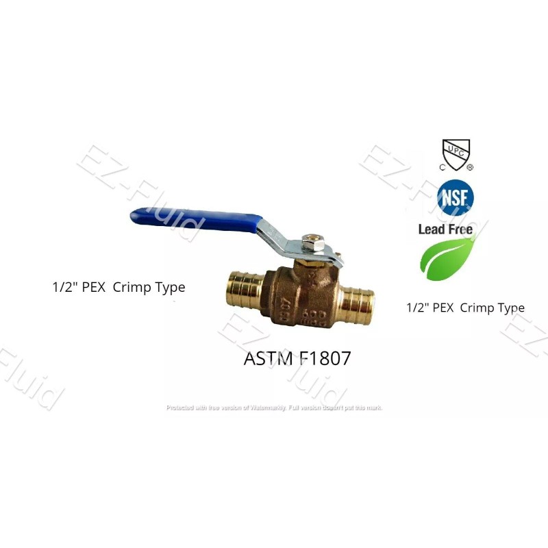 EZ-Fluid Pack of 10 Pcs, 1/2" Pex Quarter Turn Full Port Brass Stop Repair Water Shut Off Ball Valve Lead Free, Pex Fitting on Both End, Barb Crimp Ring Type ASTM standard F1807. The lead free full port PEX ball valve feature 1/2 inch connections for PEX tubing on both ends and is useful for heavy duty commercial and residential applications. Typical uses include domestic hot cold water systems and natural gas. The valve is operated with a chrome plated Brass handle covered with a vinyl grip. The handle lever makes a 90 degree quarter turns by opening or closing A valve. The construction of heavy duty forged Brass valve pressure is rated 150 psi for steam and 600 psi for water, oil and gas (wog). this lead free product has been rated nsf-61-g by UPC standards