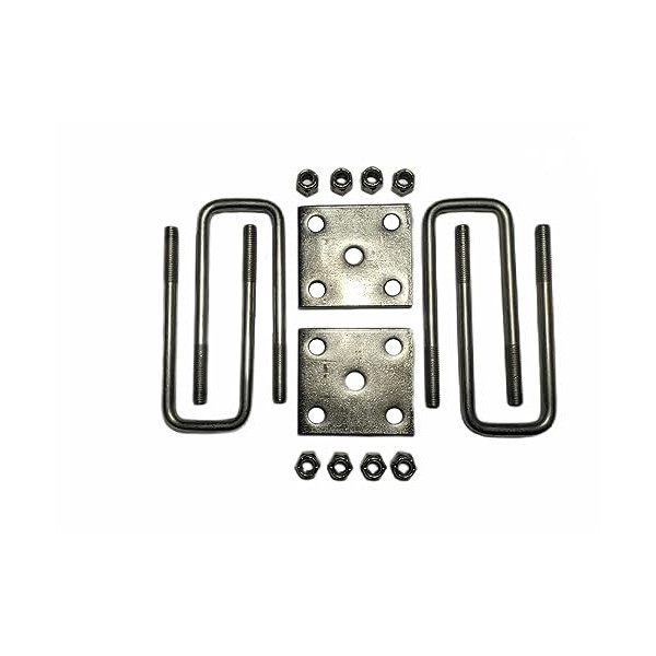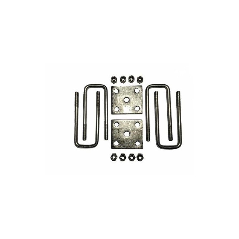 This Axles to Leaf Spring Mount Kit is to attach 2" Axles to the springs. Includes all of the hardware to attach 1 axle to 2 leaf springs on trailers with a 2" x 2" axle (2 plates, 4 u-bolts, 8 nuts). Heavy duty plate and bolts are zinc coated for durability and longevity. U-Bolts are 4 1/2" long x 1/2" diameter