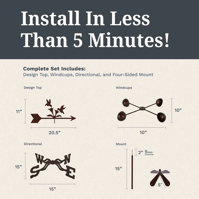 - Complete Kit – EZ Vane Hummingbird weathervane includes an intricate laser-cut Hummingbird design topper, 4-sided mount, windcups with sealed ball bearings, and an EWNS indicator to show wind direction.