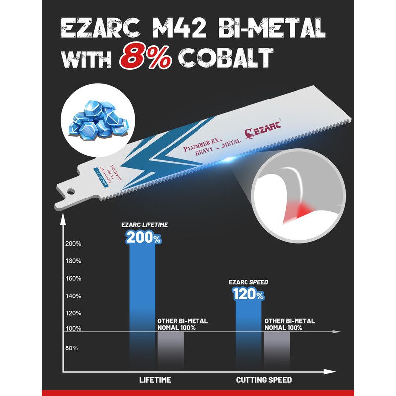 - 【Cobalt Teeth】EZARC M42 Bi-Metal reciprocating saw blades feature 8% cobalt teeth, engineered to endure high temperatures in heavy metal cutting and demolition, ensuring long-lasting performance.