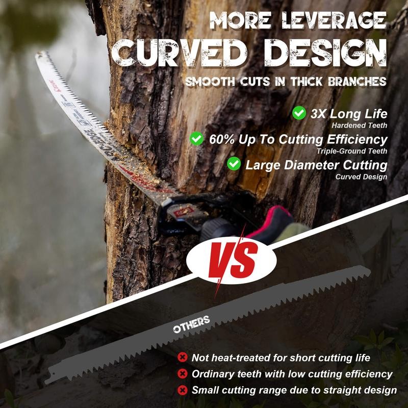 Innovative arc edge design and triple-ground offset teeth profile provides 3 cutting angles to reduce friction for a smooth and controlled cut when cutting through larger branches and limbs.