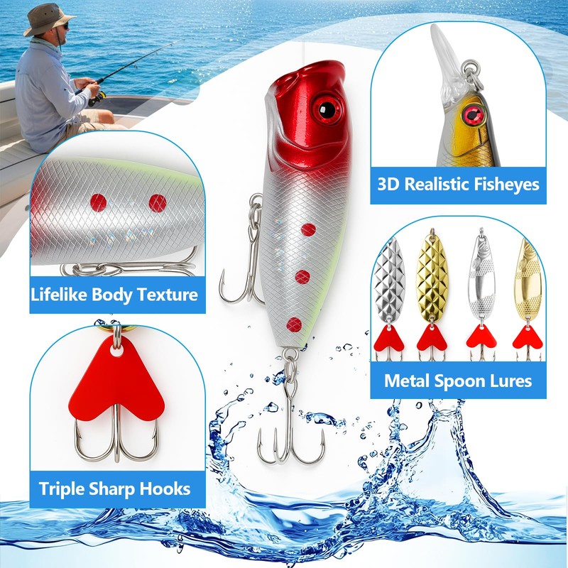 - 【Diverse Fishing Lure Collection】Our fishing lures are diverse and are placed in 24 compartments, including 6 topwater lures, 2 submerged lures, 6 soft lures, and 10 spoons, providing an exciting journey through the fishing season