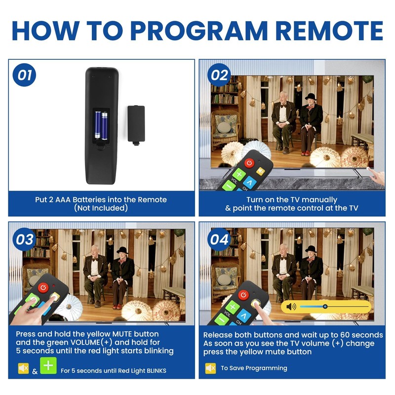 - Easy to Program: Just turn on your TV and point the remote at the TV. Press and hold the Mute & Volume+ buttons together for up to 60 seconds. As soon as your volume+ changes, release the buttons to program the remote.