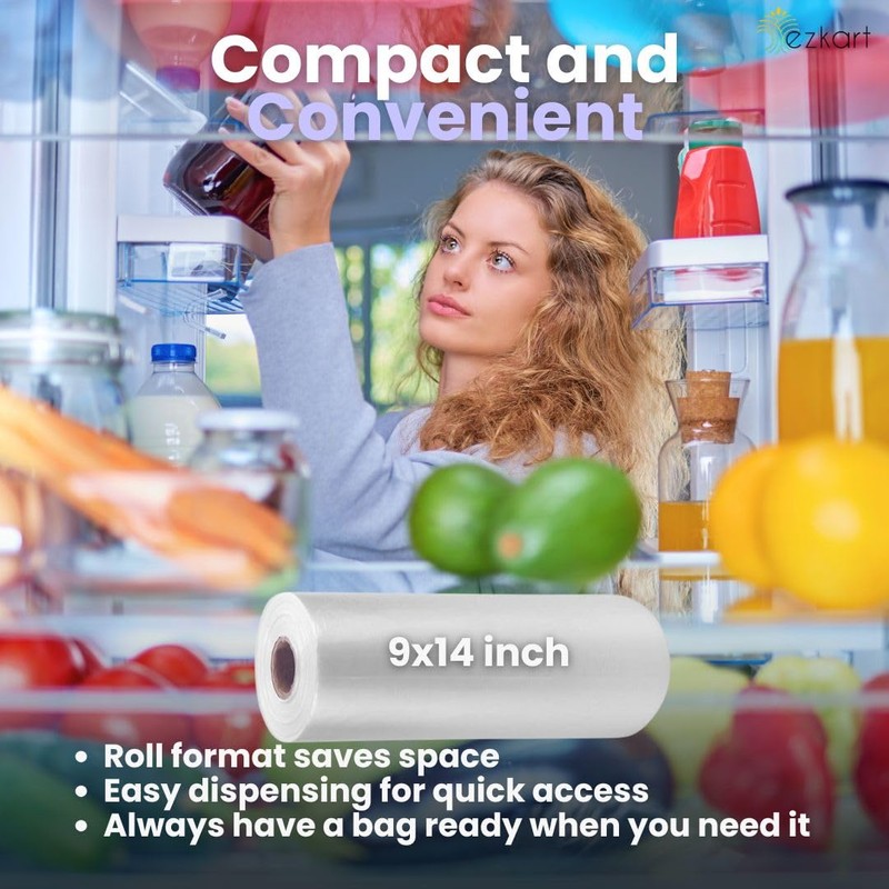 ezkart 500 Clear Plastic Food Bags on a Roll Ideal for Storing Fresh Fruits, Vegetables, Nuts, Sandwiches, Freezing, and More | Disposable and Reusable for Versatile Use. (1000, 9x14 Inch)