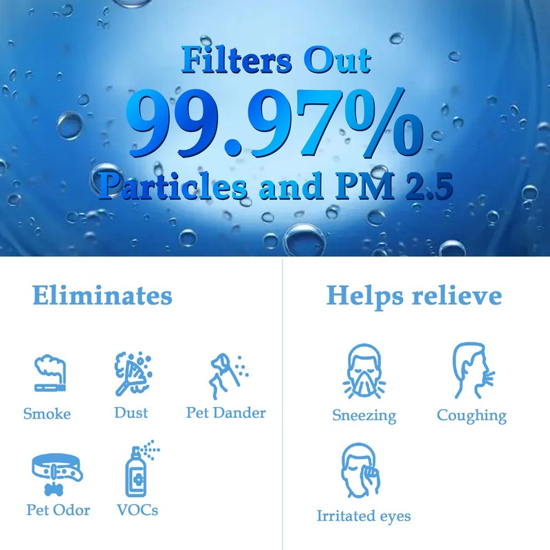- H13 True HEPA: Adopt True HEPA Filter with H13 grade which meets the High-Efficiency Particulate Air (HEPA) standard. The air filters catch particles as small as 0.3 microns. Filters 99. 97% Hair, Pet Dander, Fiber, Smoke and Dust.
