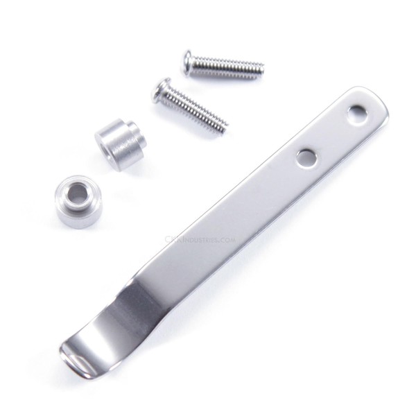 This is the Model 35 universal pocket clip. It comes standard with a polished stainless steel finish and full mounting hardware. This model is very adaptable and will work for almost any knife, flashlight, or carry item design. This pocket clip comes with (2) mounting spacers and (2) 2.5 x .45 x 10 mm stainless steel mounting screws. The M35 pocket can be modified to decrease the standoff distance by sanding a bit of length from each mounting post.
