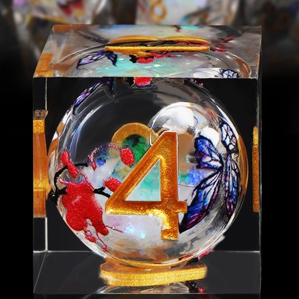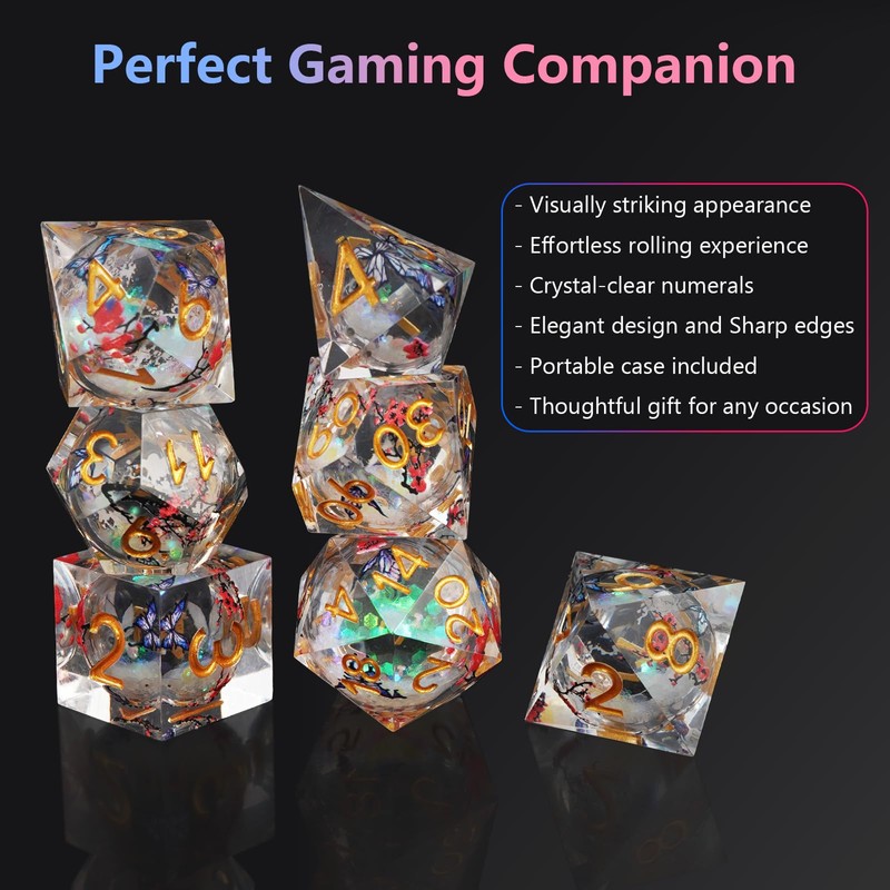 - 【Beauty Since Design】Inspired by butterfly and plum blossom, each die in this liquid core dice set features image printed on stickers inside, creating a whimsical swirling effect. This eye-catching design adds a dash of magic to every roll, perfect for gamers who love unique, thematic accessories.
