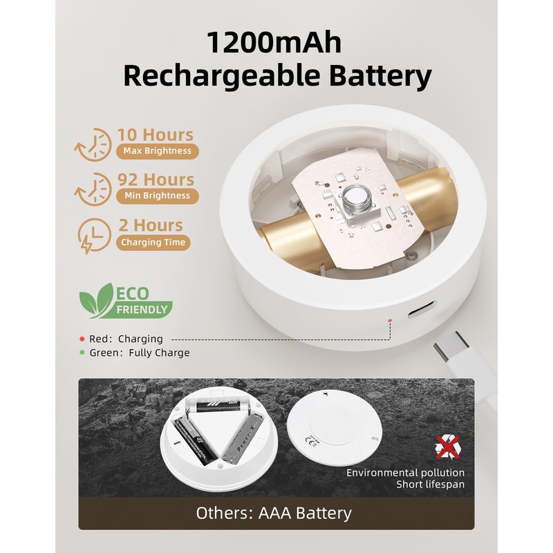 - 【 1200mAh Rechargeable Battery 】— With the convenience of Type-C technology and 1200mAh large rechargeable battery, you can fully recharge these Tap lights for indoor use in just 2 hours, ensuring you always have reliable and long-lasting lighting.