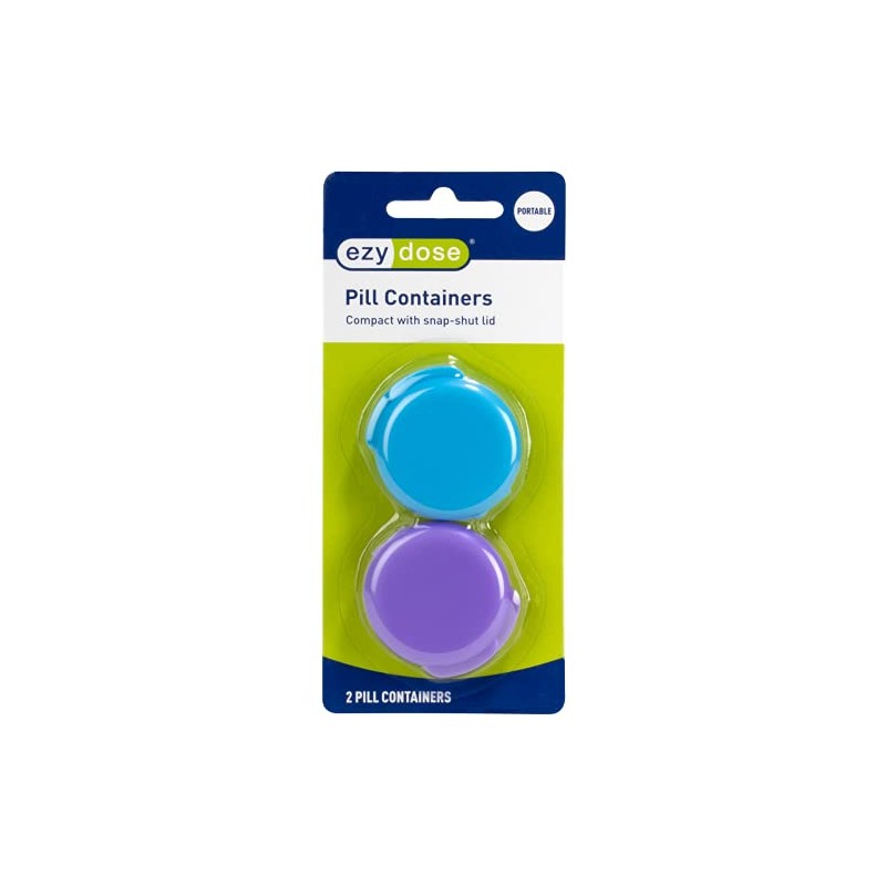 Ezy Dose Daily Round 2 Pack- Pill Containers - Includes two pocket sized pill containers that are perfect for taking your medication on the go or travel . The pill container has spacious storage and snap-shut lids to prevent spilling. Use the containers to carry medications, vitamins or other small items discreetly. The main features of the Pill Container include: Snap-Shut Lids - The case's lids resist accidental opening even when dropped. Spacious Storage - The container can hold 26 Aspirin. Two Pack - Includes two pill containers. Multiple Colors - The cases are assorted in 4 different colors. About Ezy Dose: Ezy Dose is the leader in easy-to-use medication management products. Many of our push-button pill planners are endorsed by the Arthritis Foundation for our ease-of-use design. Ezy Dose products make living healthier simply easier with products like pill cutters, pill crushers and a full line of easy-fill planners.