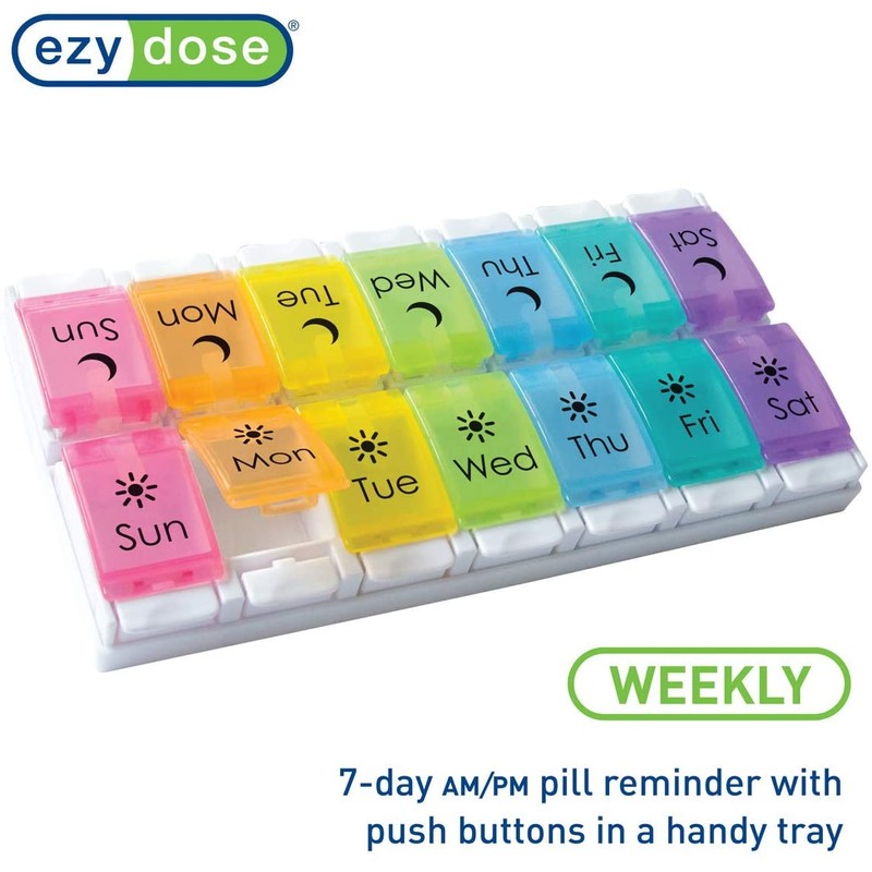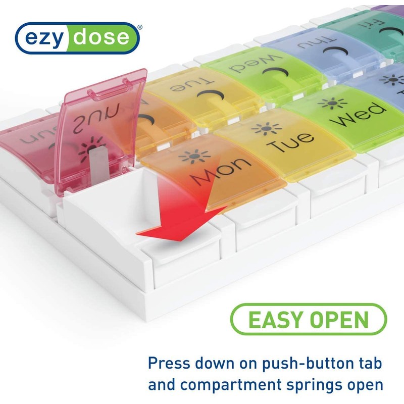 EZY DOSE Weekly (7-Day) Pill Case, Medicine Planner, Vitamin Organizer, 2 Times a Day AM/PM, Removeabale Trays, Large Push Button Compartments, Easy to Use, Arthritis Friendly, Rainbow Lids, BPA Free