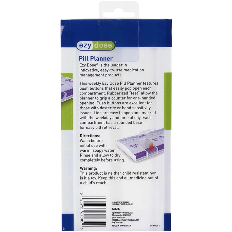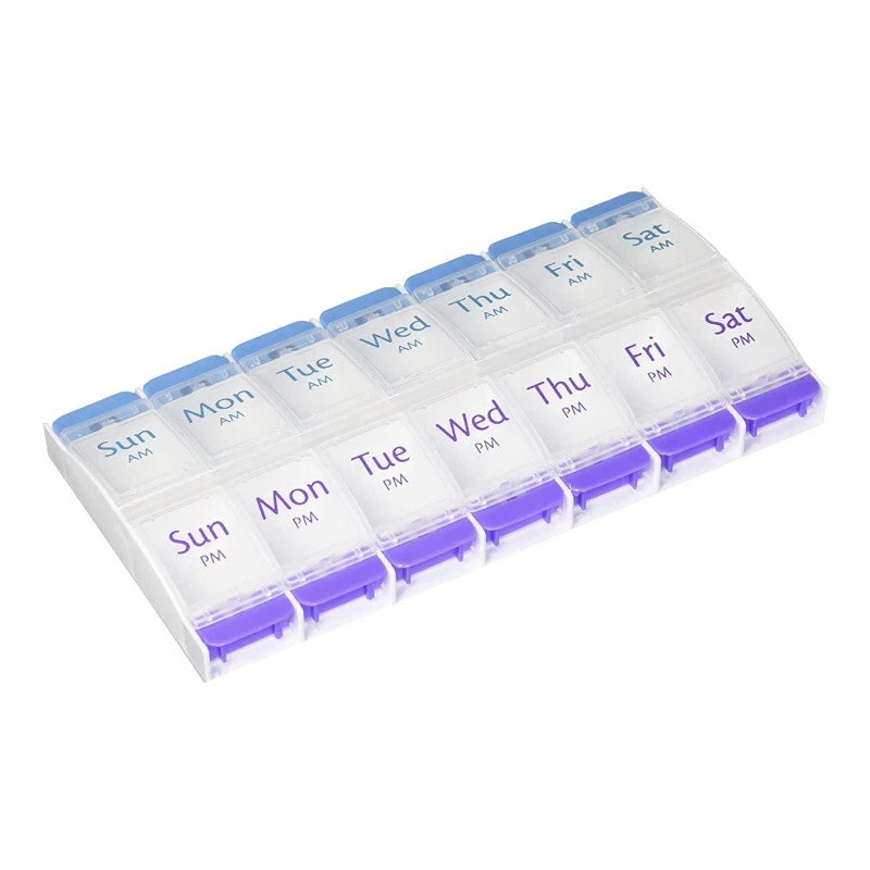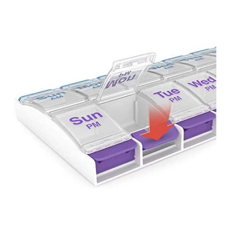 This AM/PM Weekly Pill Organizer is Perfect for Scheduling Your Week's Medication. Its Push Buttons and Transparent Lid are Simple To Use and Help You Keep Track Of Your Medication Through The Week . This 7-Day Pill Planner is designed for easy use. Its buttons and rounded bottom make it easy to open and retrieve medications. Separate AM/PM compartments make it easy to organize pills taken twice a day. The product's clear lid allows easy visibility of medication to help prevent missing doses..
