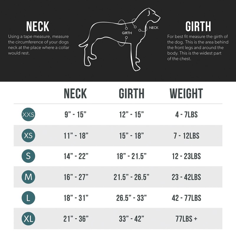 - SELECT THE BEST SIZE: Fit matters! If you are close to the end of a size, choose the larger of two sizes: GIRTH in inches: XXS 12”-15”, XS 15”-18”, SM 18”-21.5”, MD 21.5”-26.5”, LG 26.5”-33”, XL 33”-42”