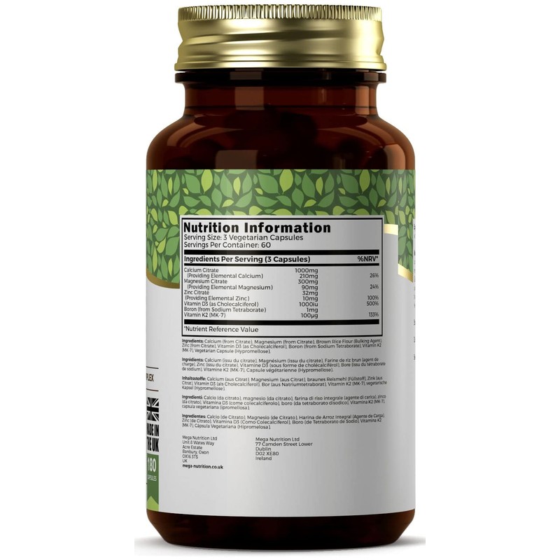 - GREAT QUALITY INGREDIENTS - Each daily serving of 3 capsules provides Calcium (from Citrate) 1000mg, Magnesium (from Citrate) 300mg, Zinc (from Citrate) 10mg, Vitamin D3 (as Cholecalciferol) 1000iu, Boron (from Sodium Tetraborate) 1mg, Vitamin K2 (MK-7) 100µg. Each bottle contains 60 capsules.