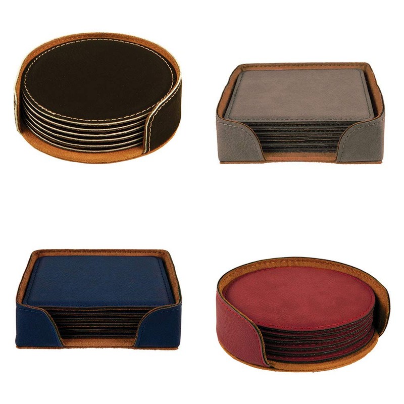 - Coasters made from high-quality leatherette laser engraved producing a permanent and highly detailed design.