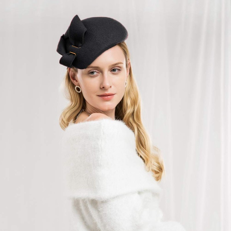 F FADVES Women Wool Derby Hat for Women Pillbox Hat Wedding Hats Felt Bowknot Fascinators Black