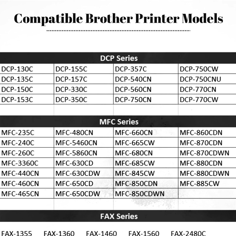 100% compatible with: Brother MFC-230C, MFC-240C, MFC-440CN, MFC-465CN, MFC-665CW, MFC-685CW, MFC-845CW, MFC-885CW, MFC-3360C, MFC-5460CN, MFC-5860CN, DCP-130C, DCP-330C, DCP-350C, DCP-540CN, DCP-560CN, FAX-1360, FAX-1860C, FAX-1960C, FAX-2480C, FAX-2580C Inkjet printers