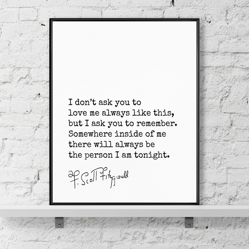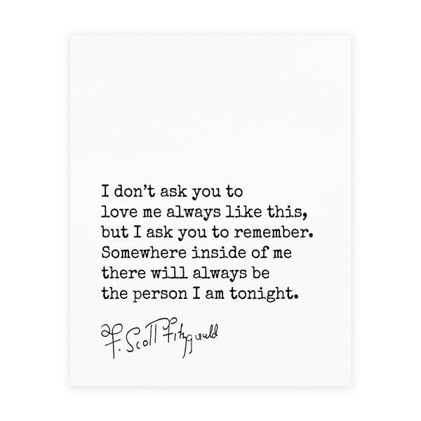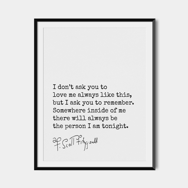 This unframed F. Scott Fitzgerald wall art uses a font taken from an old Underwood typewriter. The love quote is from Fitzgerald's novel Tender is the Night "I don't ask you to love me always like this, but I ask you to remember. Somewhere inside of me there will always be the person I am tonight."