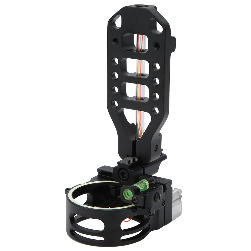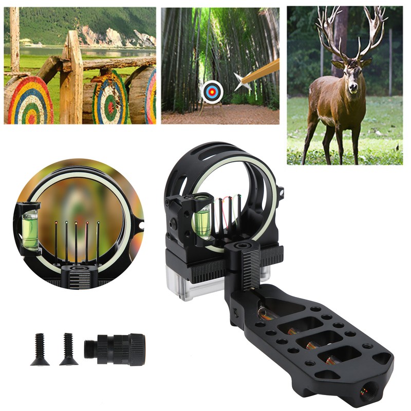 1、Clear scale auxiliary adjustment, improve the accuracy of archery. 2、The aim point is clear and easy to aim at and can be used at night. 3、Adjustable, suitable for left and right handed users. 4、Simple installation, fix it on the handle with the original screw and use it. 5、The 5‑pin range finding bow sight is made from aluminum alloy, durable.