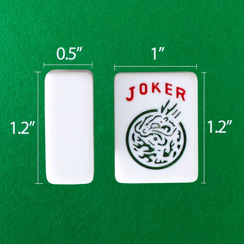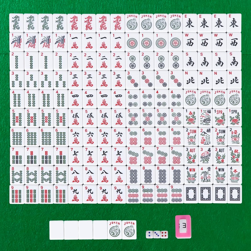 - 【Classic Full Set】166 premium white colored tiles include 36 dots, 36 bams, 36 craks, 12 dragons, 16 winds, 16 flowers, 10 jokers, and 4 blank spares. Also Includes accessories: 3 large dice , 100 money chips, and 1x bettor(wind indicator)