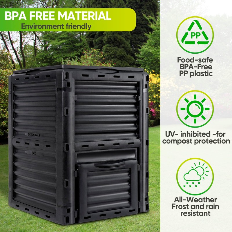 - BPA Free Material -Made of thick BPA-Free materials, compare with other products, this composter is more environmental-friendly and can withstand the outdoors and the coldest of winters. In addition, the black PP plastic efficiently maintains heat and regulates moisture to obtain shorter composting time