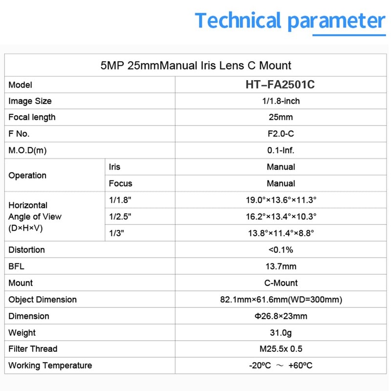 FA 25mm Machine Vision 1/1.8" Fixed Focus Lens Industrial Camera C-Mount Lens