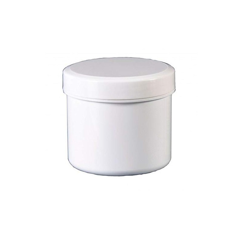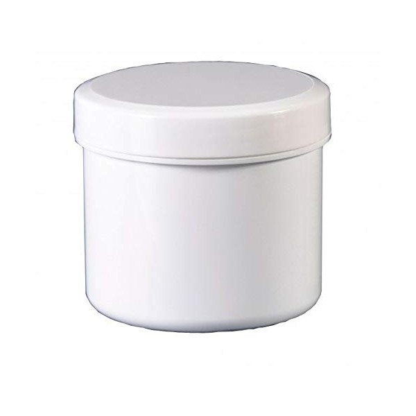 Ointment box ointment jug with screw lid white height approx. 5 cm diameter approx. 5.5 cm volume: 90 ml / 75 g material: PP The containers are suitable for filling goods: capsules, powder, ointments, granules. The can are conditionally suitable for autoclaving at 121 °. The tin is only partially suitable as sole light protection. The tin is not suitable for highly hygrocopic The Cans are not suitable for preparation, which receive dithranof