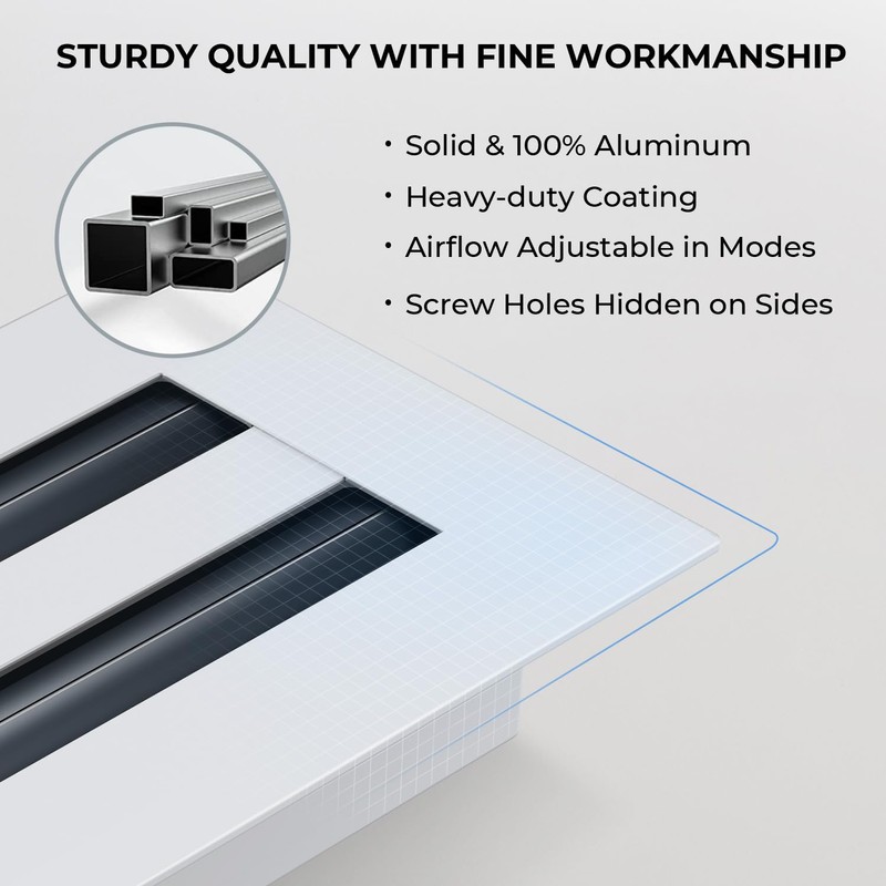 - Crafted from high-quality Aluminum (no plastic parts, weight: 1.61 lbs) with heavy-duty powder paint coated, this AC vent cover withstands heat and cold without warping, does not show rust in a high humidity area for years, and ensures robustness and long-lasting performance, making it a reliable choice for both residential and commercial applications