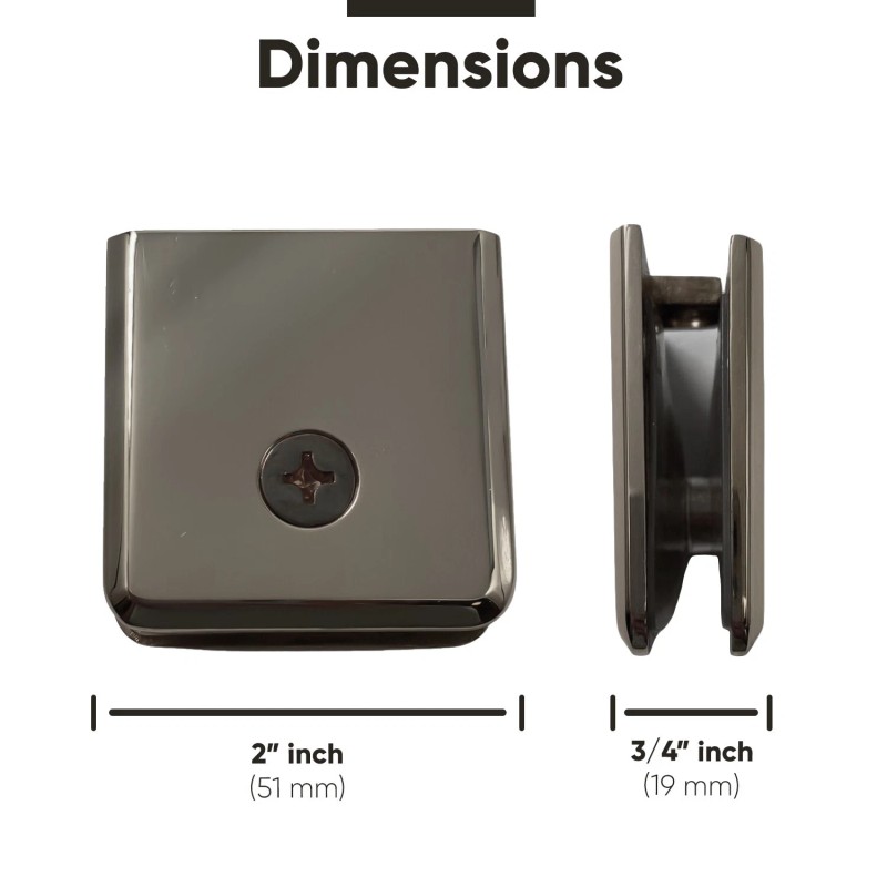 Beveled Wall Mount Clamps (Hole-in-Glass Style) mount directly to the wall, ceiling or floor to secure vertical fixed glass panels. Clearance between the glass and the wall is 3/16" (5 mm). Clear silicone can be used to provide a clean, water-resistant seal.