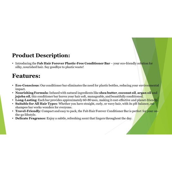 - Travel-Friendly: Compact and easy to pack, the Fab Hair Forever Conditioner Bar is perfect for your on-the-go lifestyle.
