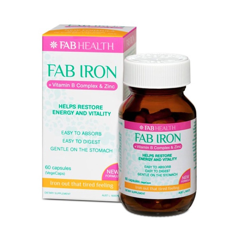 FAB IRON is a combination of easy to absorb iron and energy boosting B group vitamins to help restore energy and zinc to support your immune sysyem. The capsules are derived from vegetable origin.