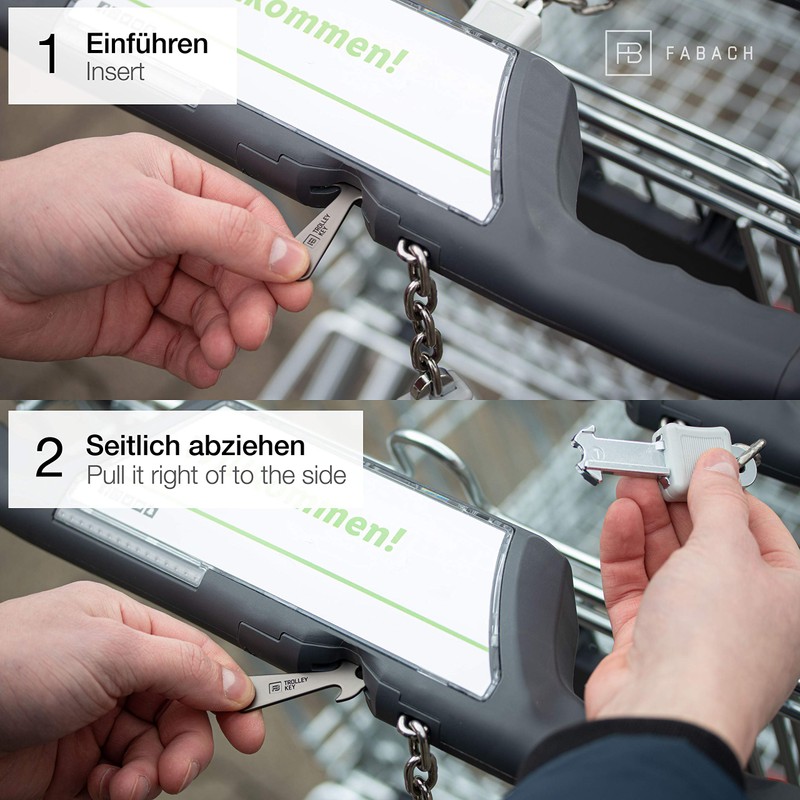 - Long service life: the "Trolley Key" is made of a 1.8 mm thick high-quality and sturdy metal alloy, a surface treatment for additional corrosion protection and an elegant logo embossing. No more cheap and environmentally damaging plastic shopping trolley chips that constantly disappear. The subtle "Trolley Key" is your new indestructible and reliable companion.