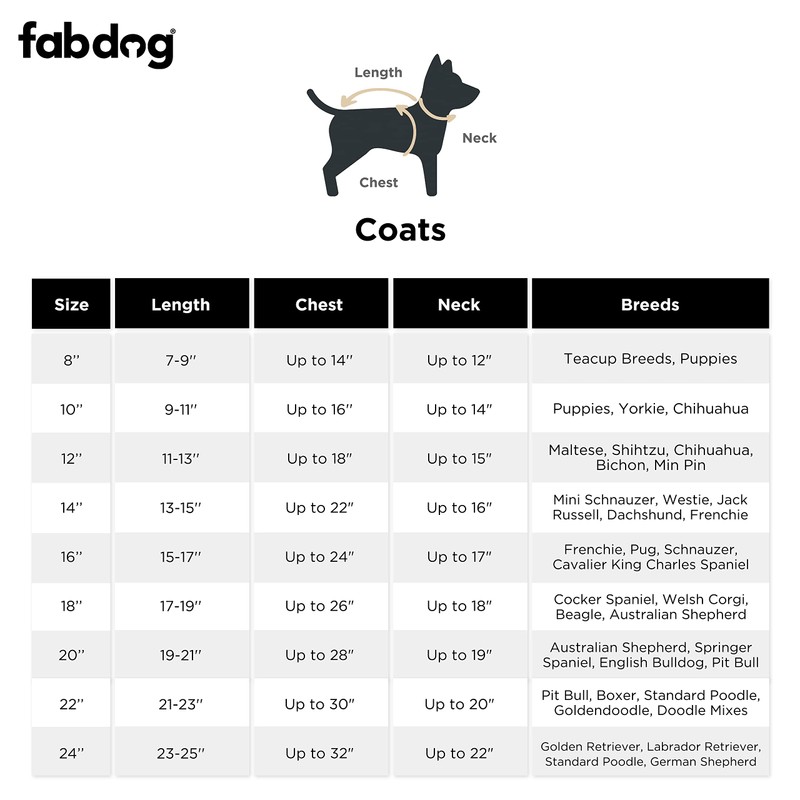 - VARIETY OF SIZES: Whether you have a small pup or a large pet, give him the comfort he craves with a Fabdog dog puffer or dog winter coat. Our pet coats for puppies and large dogs are available in sizes that range from 8-inch to 24-inch.