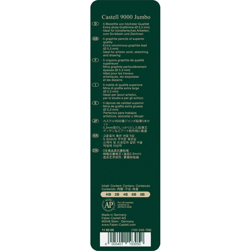 • Calidad del Grafito: Fabricado con grafito de alta calidad, el lápiz Castell 9000 ofrece una aplicación suave y consistente. La mezcla de grafito y arcilla asegura un trazo uniforme y una excelente capacidad de sombreado.