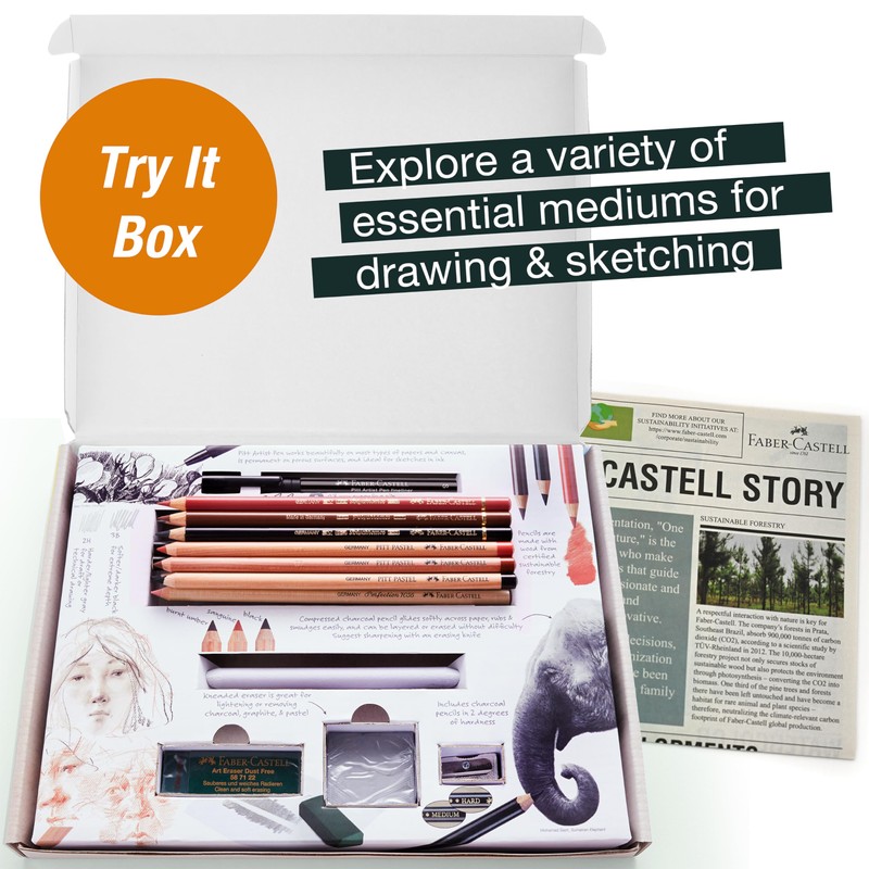 Faber-Castell Try It Box: Dry Mediums - 17 Piece Sketching Drawing Art Set with featuring Colored Pencils, Graphite Pencils, Charcoal Pencils, Pitt Artist Pen and Art Tools