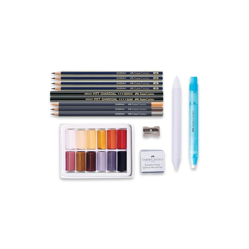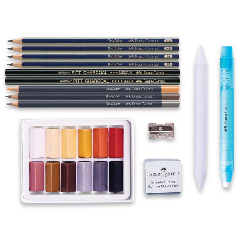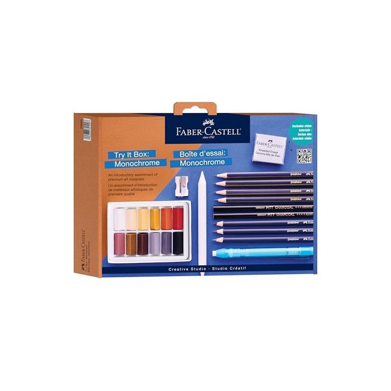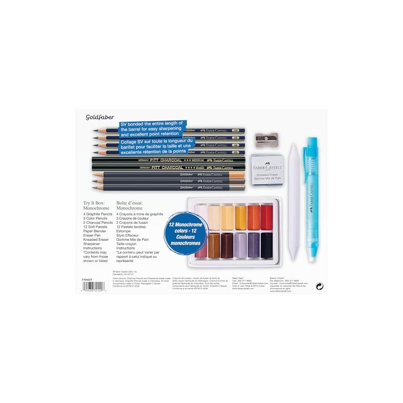 - ADULT ART KIT FOR BEGINNERS: Discover your artistic potential with the Faber-Castell Try It Box Monochrome. This introductory sketching and color pencil set includes 4 Goldfaber Graphite Pencils, 2 Pitt Charcoal Pencils, 3 Goldfaber Color Pencils, 12 Soft Pastels, a Paper Blender, a Kneaded Eraser, a Sharpener, and an Eraser Pen; everything needed to explore monochrome dry art mediums