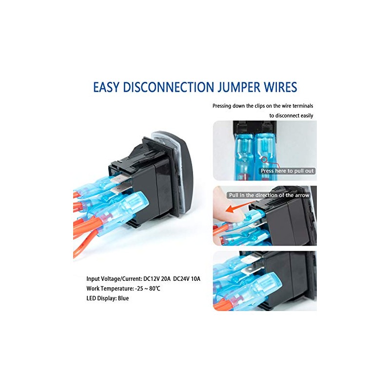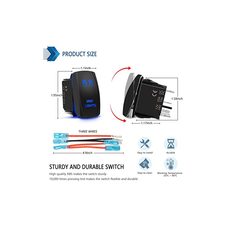 Specification:5 pin on-off rocker switch with 14 AWG jumper wires.Material: ABS+PCWaterproof: IP66Rated at 12V 20A and 24V 10A DC.SPST design (Single Pole Single Throw).Built-in 2 LEDs, laser-etched pattern, Blue LED Backlit.Product Size: 1.9"(48.3mm) x 1.04"(26.3mm).Mounting Hole Size: 1.43"(37mm) x 0.84"(21.3mm).Mainly used for controlling LED light bar, LED work lights, fog lamps, driving lights, headlights, taillights, off road lights, boat light, etc.Package Include:1x 5 pin rocker switch1x jumper wires set