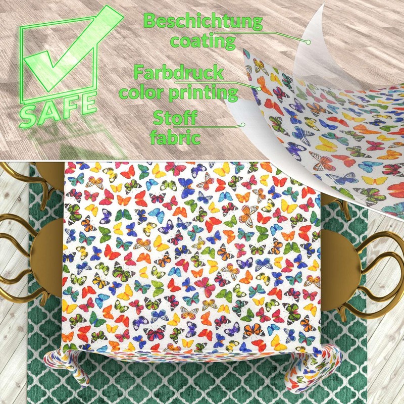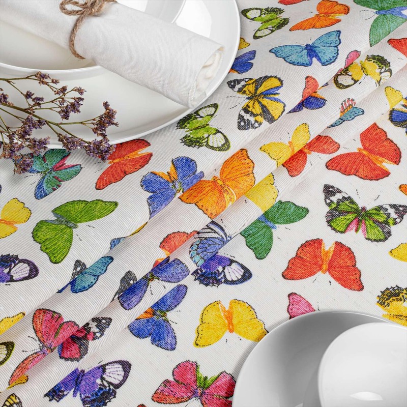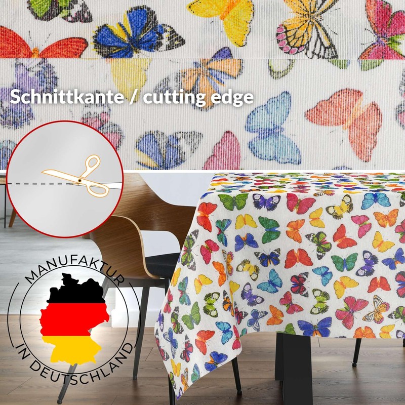 - A fabric tablecloth with a colourful butterflies pattern, 100 x 140 cm, cut edge, rectangular. Other versions also available, also in oval, round and rectangular. Very easy to clean.
