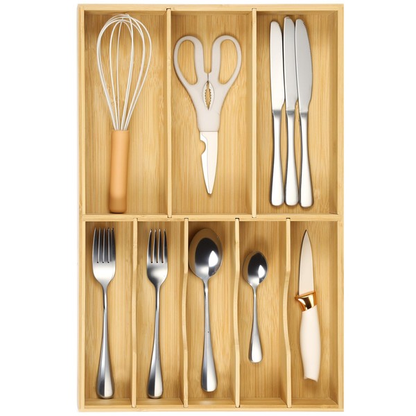 - ✅ Longer Length for Extra Storage Space: Measuring 12.8 inches wide and 19.3 inches long, this bamboo silverware organizer offers generous capacity. Its longer length provides extra space to keep your flatware and utensils neatly arranged and easy to access. No adjustments needed—just place it in and start organizing. Just be sure to measure your drawer first for that perfect, glove-like fit!