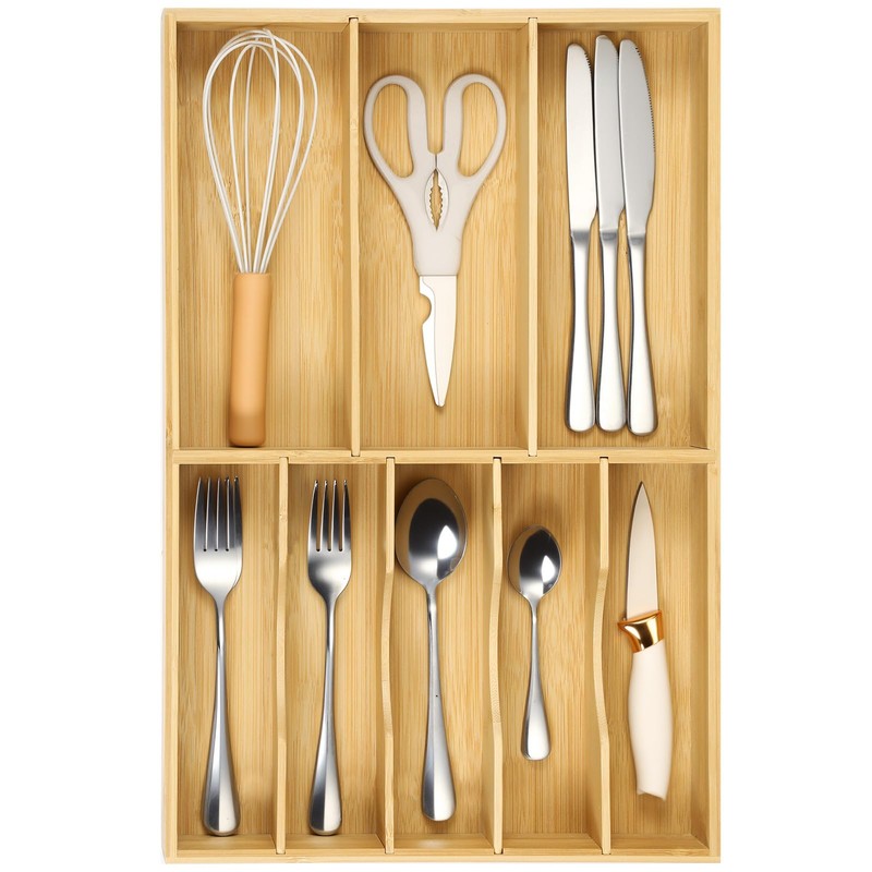 - ✅ Made of 100% Natural Bamboo: Eco-friendly and sturdy, the Fabsome silverware tray is crafted from 100% premium bamboo. Unlike plastic organizers, this one stands up to everyday use without getting scratched or scuffed by sharp utensils.