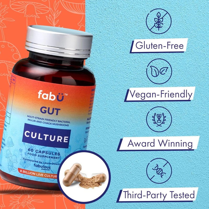 fabÜ Gut Culture - Supplements with 9 Culture Strains & Chaga Mushroom - Probiotics for Gut Health with 8 Billion CFUs & Inulin Prebiotic Fibre - Digestive Support, 60 Capsules